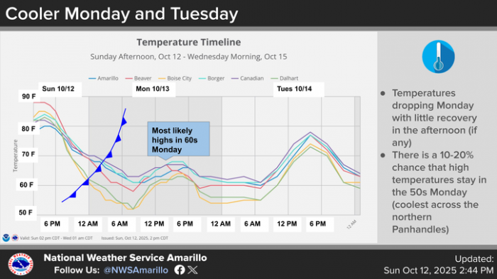 A cold front will move over the region Monday morning. This front will usher in cooler air and temperatures will drop down to near average for mid October. There is a 10 to 20% chances that highs stay in the 50s on Monday, with the best chance of these cooler temperatures being across the northern combined Panhandles. Highs return to the upper 70s Tuesday. |